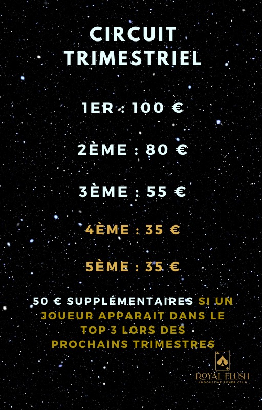 - Pour les joueurs qui souhaitent payer en plusieurs fois, 50€ minimum seront demandés pour commencer le circuit. Et les 50€ restants seront à payer sur le mois de Novembre et Décembre (2 x 25€)