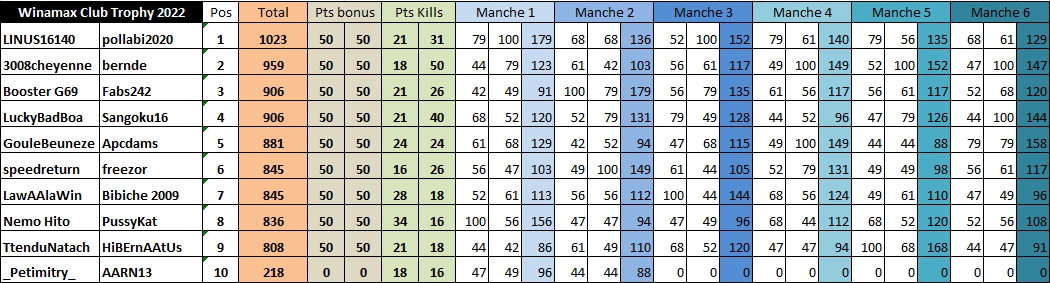 NB : Pour les Kills, je n'ai pas ceux de la manche 6, mais ça ne va pas tout chambouler le classement :P